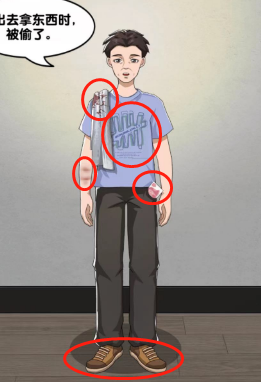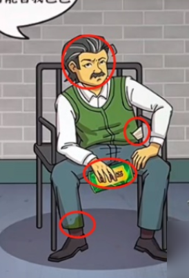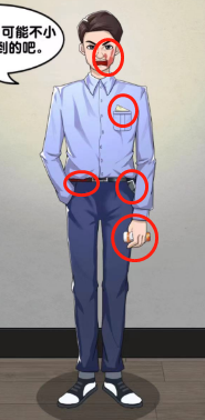 2、审查绿色衣服,手上的茶罐、口袋里的欠条和有污渍的裤脚。