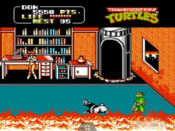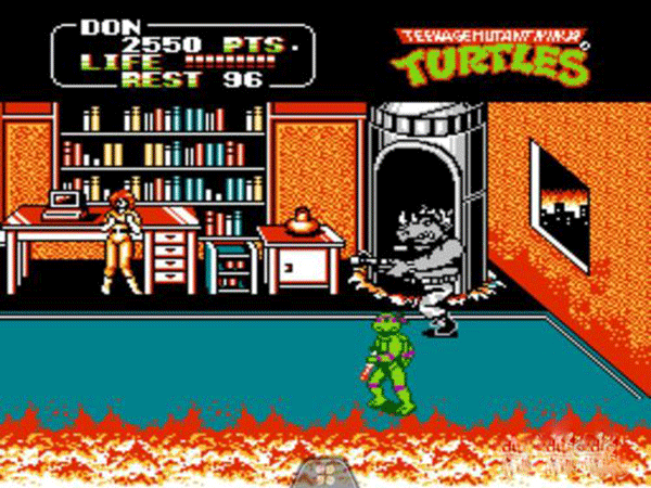 过关技巧:可以站在boss旁边然后使用普通攻击,boss在被攻击时不会攻击忍者龟,不过要注意躲避boss的子弹,一般失去两条性命就可以过关了。