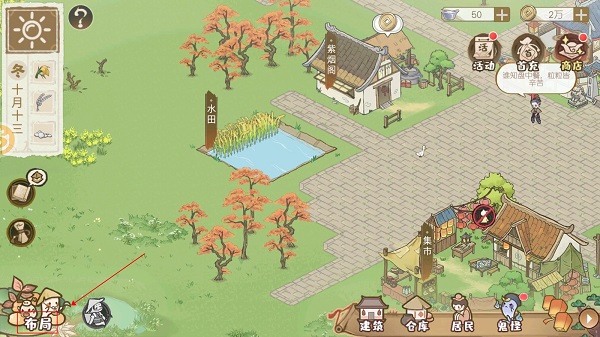当村落的收益达到一定程度的时候,就可以解锁建筑了,将酒楼放置在村落中心,毕竟可以起到消费作用,来促进整体的收益,然后商队放在贸易通道,可以提供很多的外来材料。