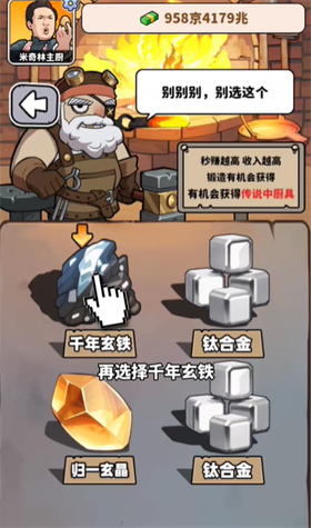 2、选择【千年玄铁】,留意铁匠的台词,如果他说“别别别,别选这个”,那就表示这个选项是可以选择的。