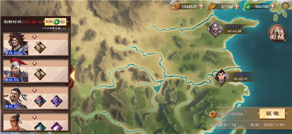在内政玩法中,主公可以对征战占领的城池领地进行内政管理,不但占领城池后不但能获得税收缴纳,还有还需要处理边境流寇、开采铁矿、演练兵法、灾民安置、山野毛贼等,主公需选择派遣合适的武将阵营前往治理执行,相应也可获得一定道具奖励。