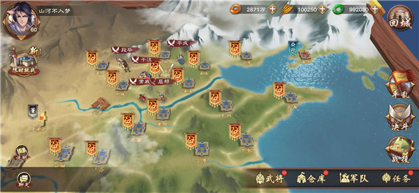 运筹帷幄智谋定天,沙场驰骋一统霸业!在征战玩法中,各位主公可作为一方君主,征战攻打魏蜀吴等不同势力的城池,在三国版图上攻略城池、扩张领土,最终实现统一天下的霸业!而攻打城池中,主公还可归还选择不同的仅供路线,更可以选择发起直接进攻,或是计谋策反等方式。此外,主公还有可能遇到关隘、港口等特殊地形战,也需要因地制宜根据不同地形,打造策略性的武将出战阵容。