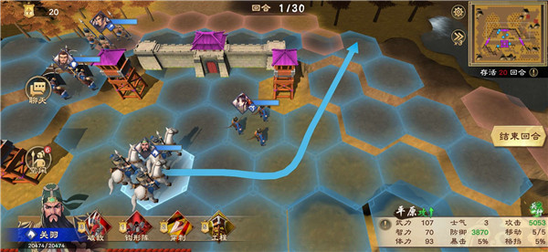 (3)占领青州县。迎着风向前冲就行,让满宠去前面控制,给曹纯开路,三匹马向前冲,蛮王最后抢个粮食,送一波。张世平死之前控一下夏侯惇。后面骑兵追不上来,上来了也没伤害。
