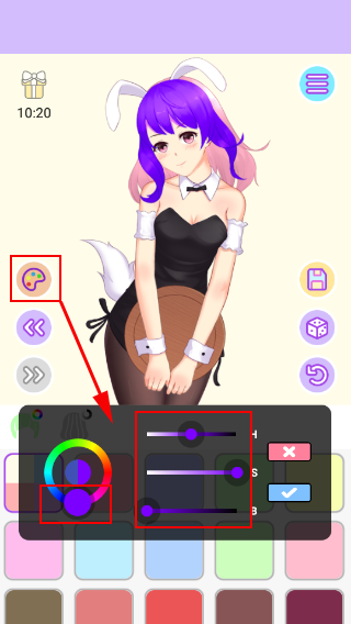 左侧画板中可对角色的发色以及头饰颜色进行自定义设置,在调色板中还可对颜色做即为细微的调整