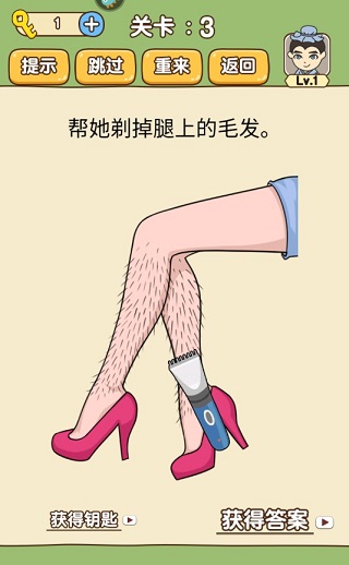 这是一款由海南乐果互娱科技有限公司开发的益智休闲游戏。游戏中包含大量的关卡,每个关卡都有一个古怪且荒谬的解谜小游戏等着你去解开。例如,有美女刮腿毛、刺激捉迷藏、球球爱分类、美妆佳人妙等。面对这些意想不到的谜题,你能否运用逆向思维,完成所有关卡的挑战?此外,游戏内还设置了不按常理出题的陷阱问题、脑洞大开的思维障碍以及恶搞趣味的想象问答等。因此,玩家需要突破常规,采用他人不敢尝试的方法来通过关卡。在这里,只有你想不到的答案。现在,一起来参加这场全民烧脑挑战,看看谁才是那个与众不同的天才!