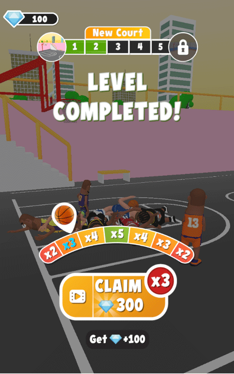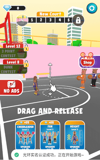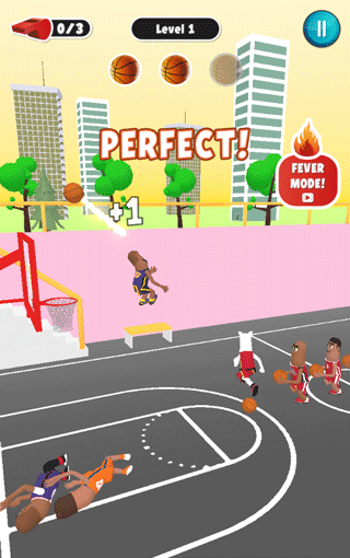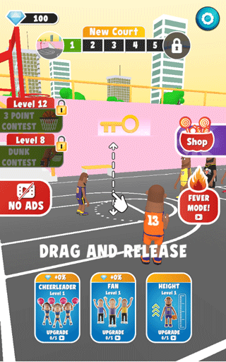 2、拖动角色起飞,瞄准篮筐,将篮球扔进篮筐,获得相应分数。