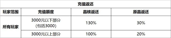 充值总金额≤3000元,可获得130%的晶核返还和30%的原晶返还。