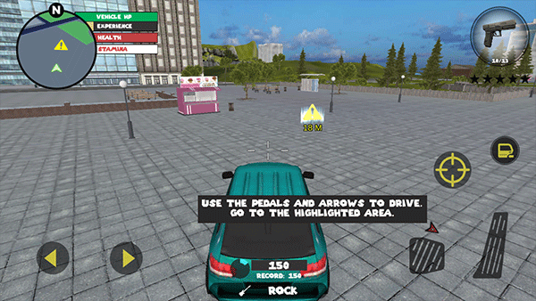 2、每当角色的附近有车辆时,屏幕的左方会有一个汽车头的按钮,点击之后就会让角色就会抢夺车辆,操纵车辆的话在屏幕右下角有两个踏板,左边是删除的按钮,右边是油门,屏幕左下角会有一个类似方向盘的东西,是用来控制方向的,对汽车的操纵一定要好,因为这是我们快速获取金币的最好的办法
