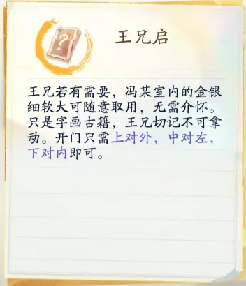 3. 在梅坞的房子里,具体位置可参照图中的小地图。进入梅坞门口后,右手边便是。同样,在桌子上能找到线索字条,线索表明要让三个碗口都朝向灯,也就是所有碗口都朝“右”,如此操作解锁机关后,便会出现一个密室。