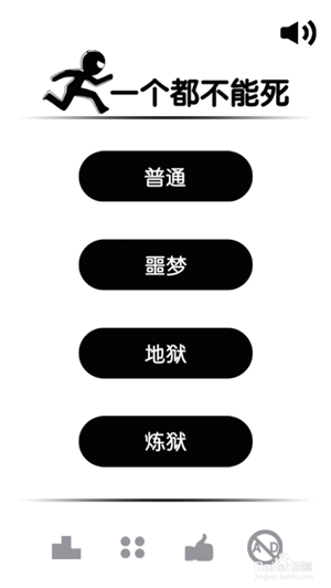 在本页面下载并安装“一个都不能死”免费版,然后启动游戏。游戏提供四种模式:普通、噩梦、地狱和炼狱。我们选择普通模式即可。别以为普通模式的判定会比较宽松,实际上游戏的判定非常严格,难度略高于“flappy bird”。火柴人起跳过早会导致腿部触碰障碍,起跳过迟则会直接碰撞。此外,每排火柴人遇到障碍的时间各不相同,这使得游戏极具挑战性。