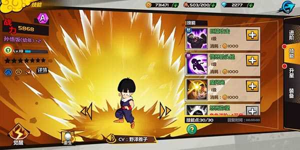 技能效果:孙悟饭幻化成巨猿,攻击当前目标及后排对位目标造成(伤害力*765%+固定伤害)点物理伤害,本次和之后的怒气技提高10%攻击力,该效果最多叠加三次.