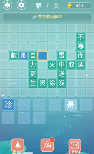 第7关答案:敝帚自珍、自力更生、生灵涂炭、雪中送炭、火中取栗、不寒而战。