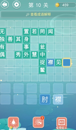 第10关答案:置若罔闻、无独有偶、独善其身、瓮中捉鳖、秀外慧中、置身事外、捉襟见肘