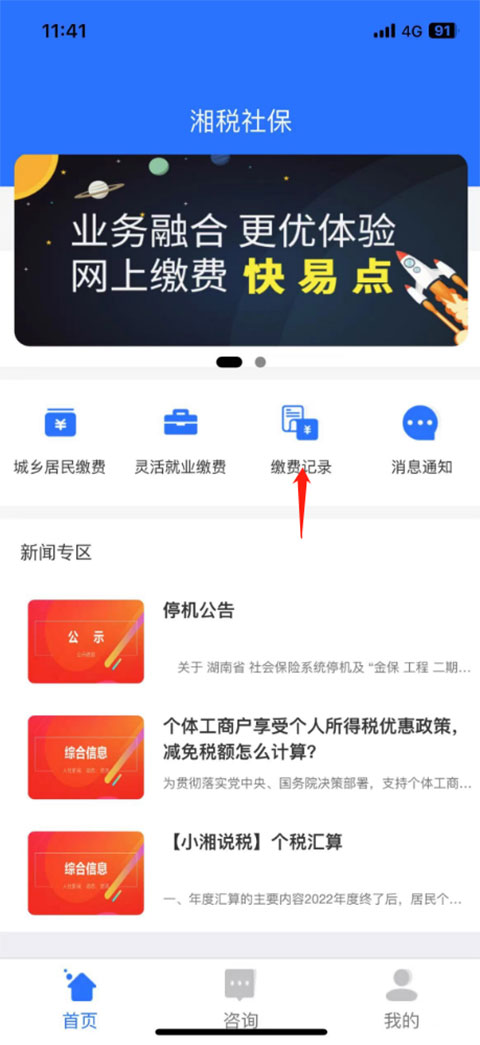 1、在湘税社保的首页,点击缴费记录;