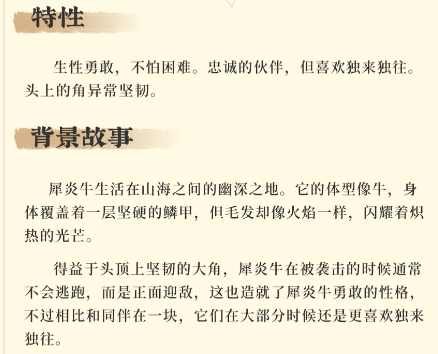 犀炎牛最大的特点,就是头顶上有着一只坚韧的大角。若是遭遇突袭,它们大多数情况下不会直接逃跑,而是用自己的角将敌人撞飞。