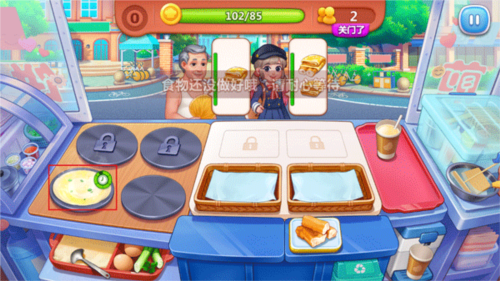 在做煎饼时,右上角的绿色圆圈表示它快要成熟的时间,如果变成了红色圆圈,就表示快要烧焦的时间。你只要在它立马变成红色圆圈时那个客人即可。你只要每天赚到一定数量的金币就可以关门啦!