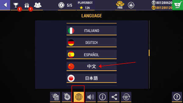 最后选择“地球”图标,将语言调整为“中文”就设置好中文了。