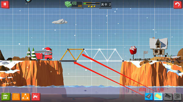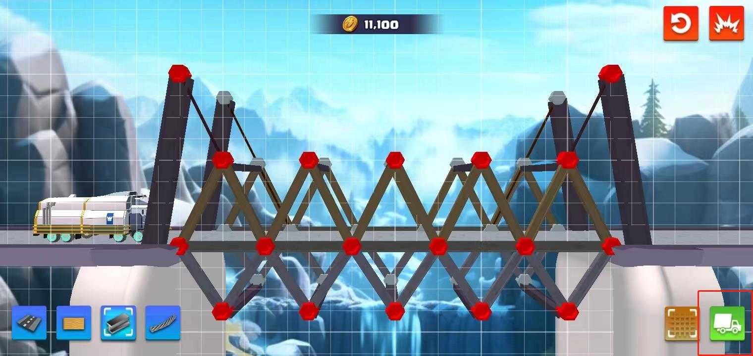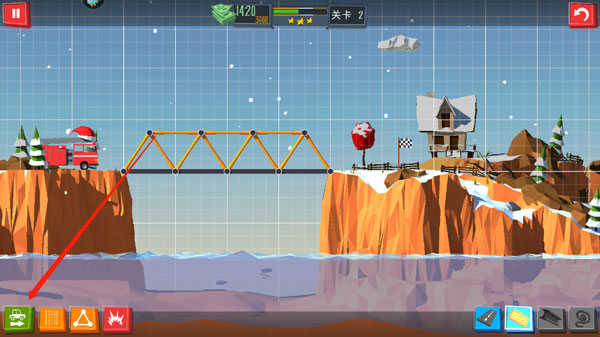 搭建好桥之后,点击左下方的开车按钮,即可完成通关,我们要做的就是争取花最少的圆子完成桥梁建造
