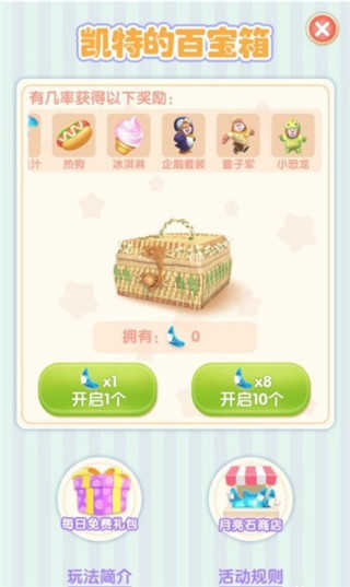 使用专属道具月亮石可开启百宝箱,每次开启宝箱需消耗1个月亮石,可使用8个月亮石,一次开启十个宝箱,开启宝箱可随机获得熊熊乐园、玩偶公仔、食物和金币等。