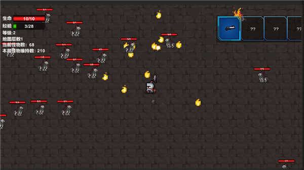在地图两侧和地图正上方的通道里每层都有怪物数量上限,并且会一直保持,每层加两点上限不要站在地图中间容易被包围。