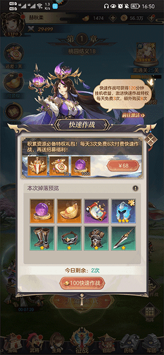 快速作战可以获得120分钟挂机收益,每天免费一次领取,使用元宝可以额外再作战3次。如果激活快速作战特权,每天可以免费3次,使用元宝可以额外再作战8次。小编建议非RMB玩家还是不要买这个快速作战特权,每天坚持挂机就可以了。