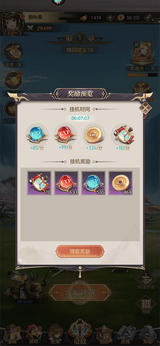 在征战中玩家通过不断的战斗通关可以获得大量经验值,这也是升级最快的一种方法,而且玩家还可以开启挂机模式,只要将手机放在一旁就能拥有丰富的挂机奖励可以领取,不过挂机时间会有上限,上限随着等级上升而提高,达到顶峰后将不再获得收益,所以要尽快领取奖励。