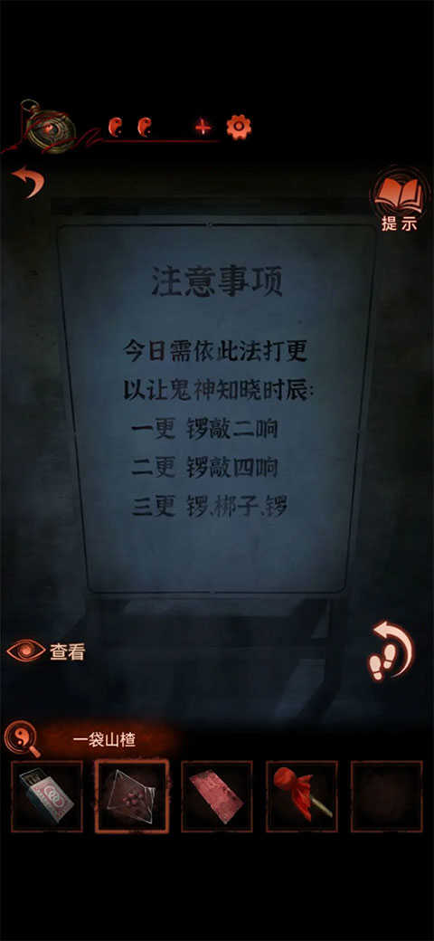 中间场景的告示牌,点右下角那个可以变化,得到线索。接着就可以去敲左侧场景白无常手上的铜锣。(几个灯笼亮代表几更)
