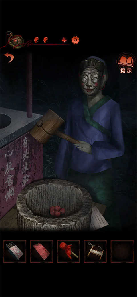 接着到右侧场景,把面具给纸人戴上,山楂放进去,得到“子弹”。