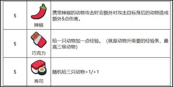 Chili/辣椒: 给予 1 个随从 Splash Attack,使可以对被击打动物后方小动物造成 5点伤害