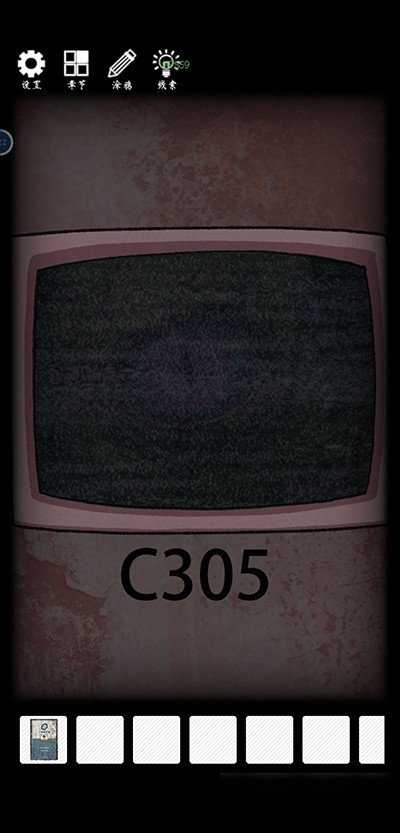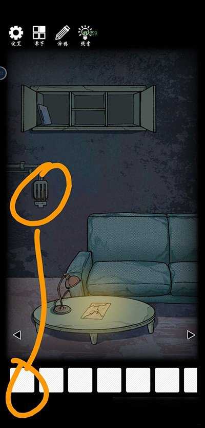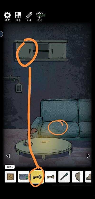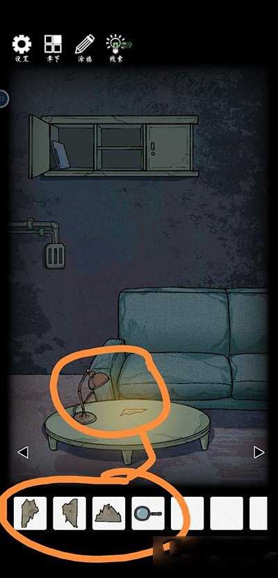 左转,提升沙发坐垫,获取残缺的平面图。使用钥匙c开启左侧的柜子,获取线索。