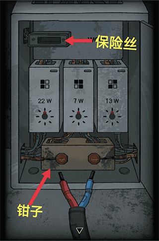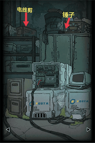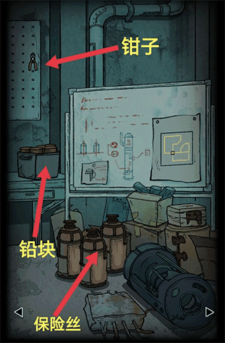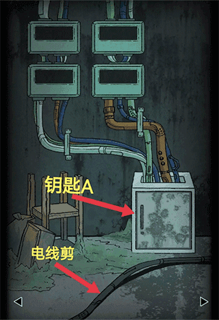 柜子下方右边柜门打开获取【钳子】,用【钥匙B】打开左方柜门,发现手电筒。
