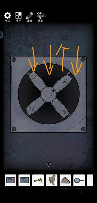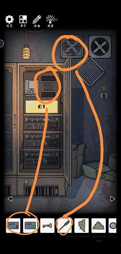 左转再左转,利用铁棍破拆得到开关。使用螺丝刀拆卸风扇外壳,获取线索。放置两块存储介质。