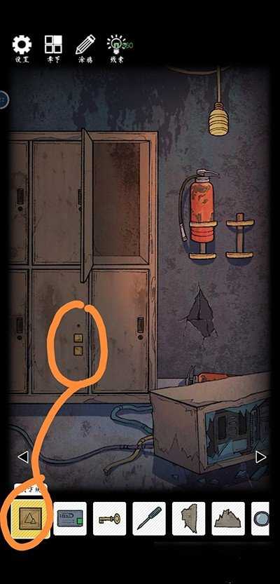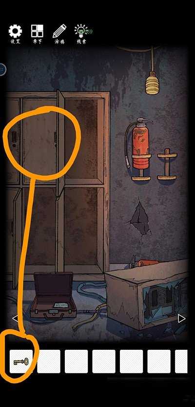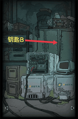 左转,拖起灭火器,获取钥匙b。着力按压两次墙缝,获取钥匙c。启动柜子,获得螺丝刀。轻触右下角两次,获取存储介质及铜方块。