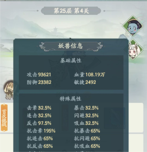 寻道大千镇妖塔的怪物,我们可以在界面查看怪物的属性以及精怪宠物加成效果。