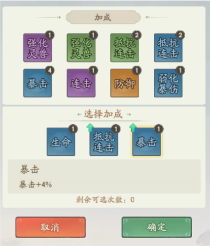 寻道大千镇妖塔中还有一个能帮助爬塔就是加成系统。每达到新的一层可以选择通过系统随机给的属性中选择一个。刷新出的加成属性是有4种颜色的。从低到高分别是绿-蓝-紫-橙。