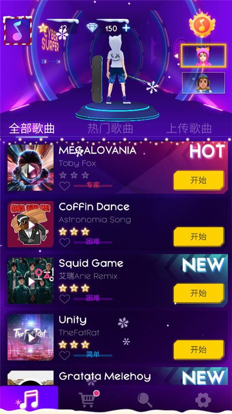 返回主页面,挑选“全部歌曲”“热门歌曲”或“上传歌曲”,自由选择你最爱的旋律开始挑战;