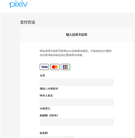 5、这将引导您到达绑定卡片的支付页面,在该页面上,您需要输入所购海外虚拟信用卡的卡号、持卡人姓名、有效期及安全码。请仔细检查您输入的信用卡信息,随后点击“绑定卡片后使用pixiv高级会员”按钮。
