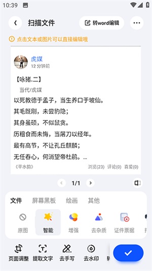 2、提取文字,精准识别图片文本,支持逐字或按段落自由选择复制,还原排版转Word在线编辑。