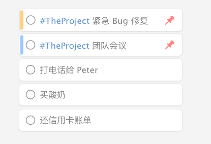 轻量级的任务列表功能,同时通过特殊语法提供#标签、重要程度、快速置顶等功能。升级高级版还可以获得子任务、提醒、重复、预计番茄数、备注等高级功能。