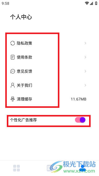 4、个人中心可以一站式管理所有功能,用户可以滑动关闭个性化广告,广告可一键消除。