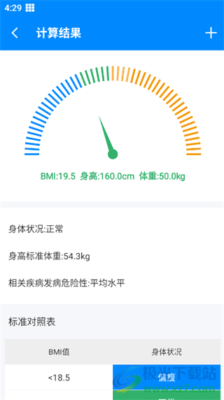 2、输入的身高体重不仅能得到BMI的计算结果,还能将结果与对照表对照了解身体情况。