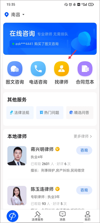 1、点击打开app进入首页,点击首页中的找律师。