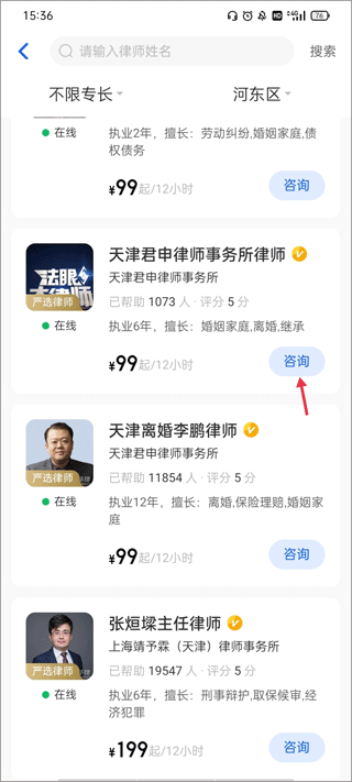 2、在搜索栏中搜索律师名或根据推荐选择律师,点击咨询。