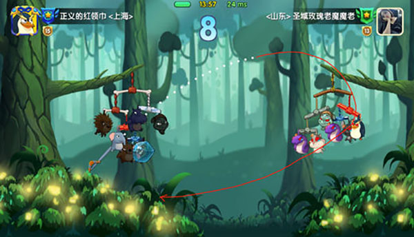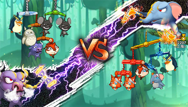 别看这些动物这么可爱,打起来一个都不含糊。别忘了,这可是款竞技游戏,虽然打起来根本没有常规对战的紧张感,但也是全球实时PVP的。玩家需要将动物们和各种棍绳进行组合搭配,选择最适合自己的方式,将对面的动物击落绳下。这样的弹射玩法不需要玩家有多犀利的操作,一键瞄准即可发射!