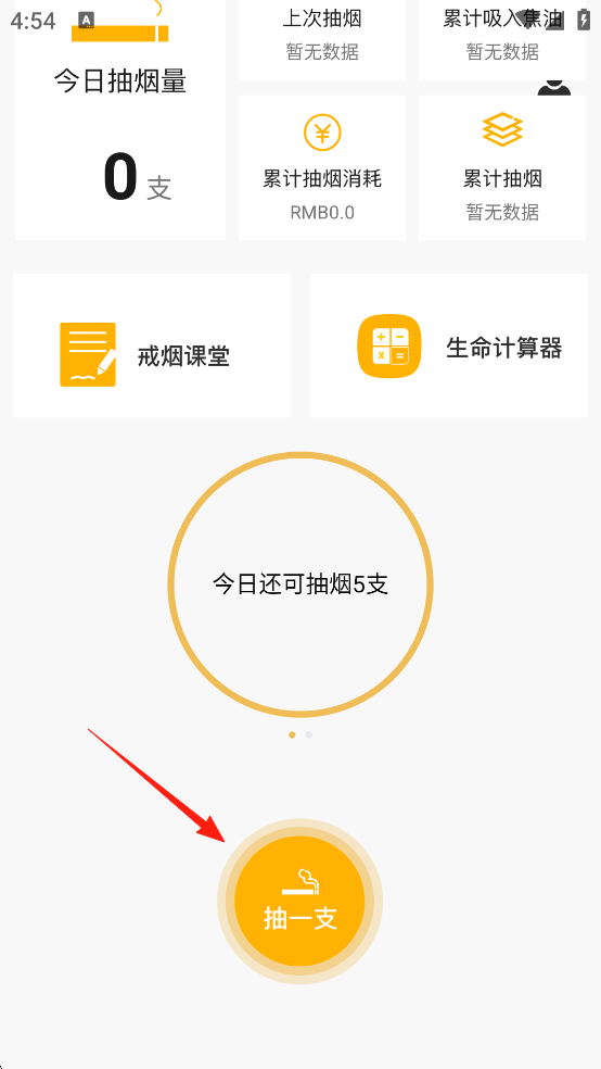填写完基础信息之后,进入软件主界面,在这里可以看到今日抽烟量、累计吸入焦油量等