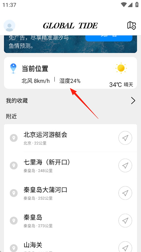 打开全球潮汐APP,在首页先定位你所在的位置或想要了解的位置;